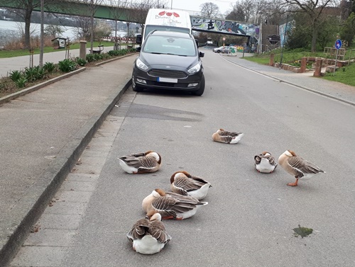 Jetzt haben auch die die Neuenheimer Gänse beschlossen, sich der „Letzten Generation/Sektion Federvieh“ anzuschließen und sich an der Straße bei der Ernst-Walz-Brücke festzukleben.